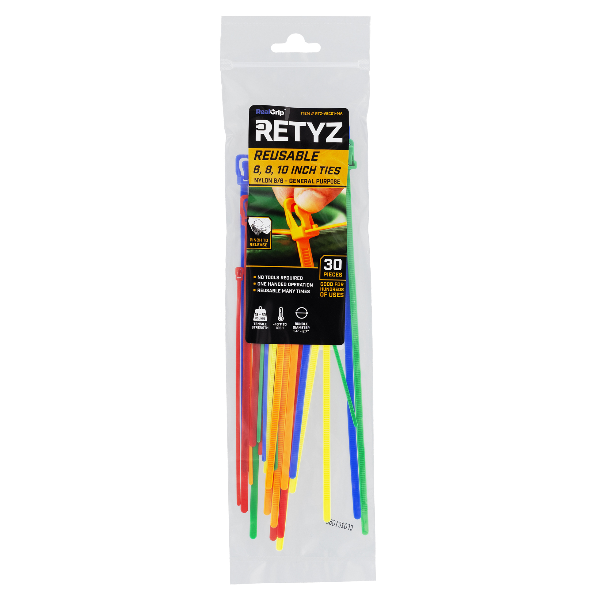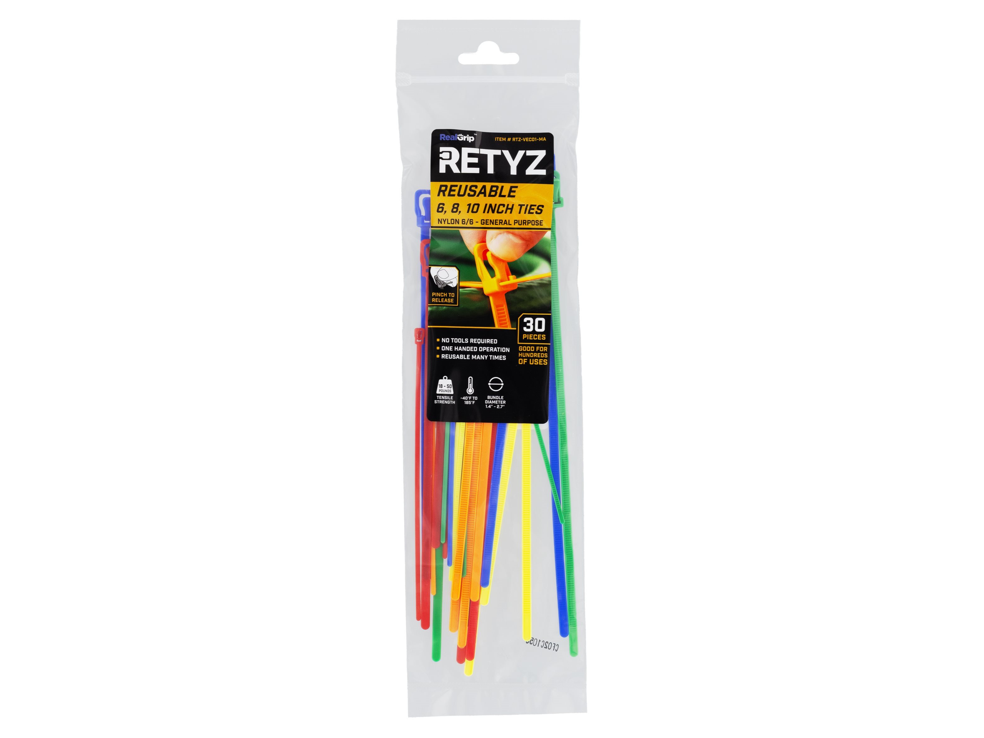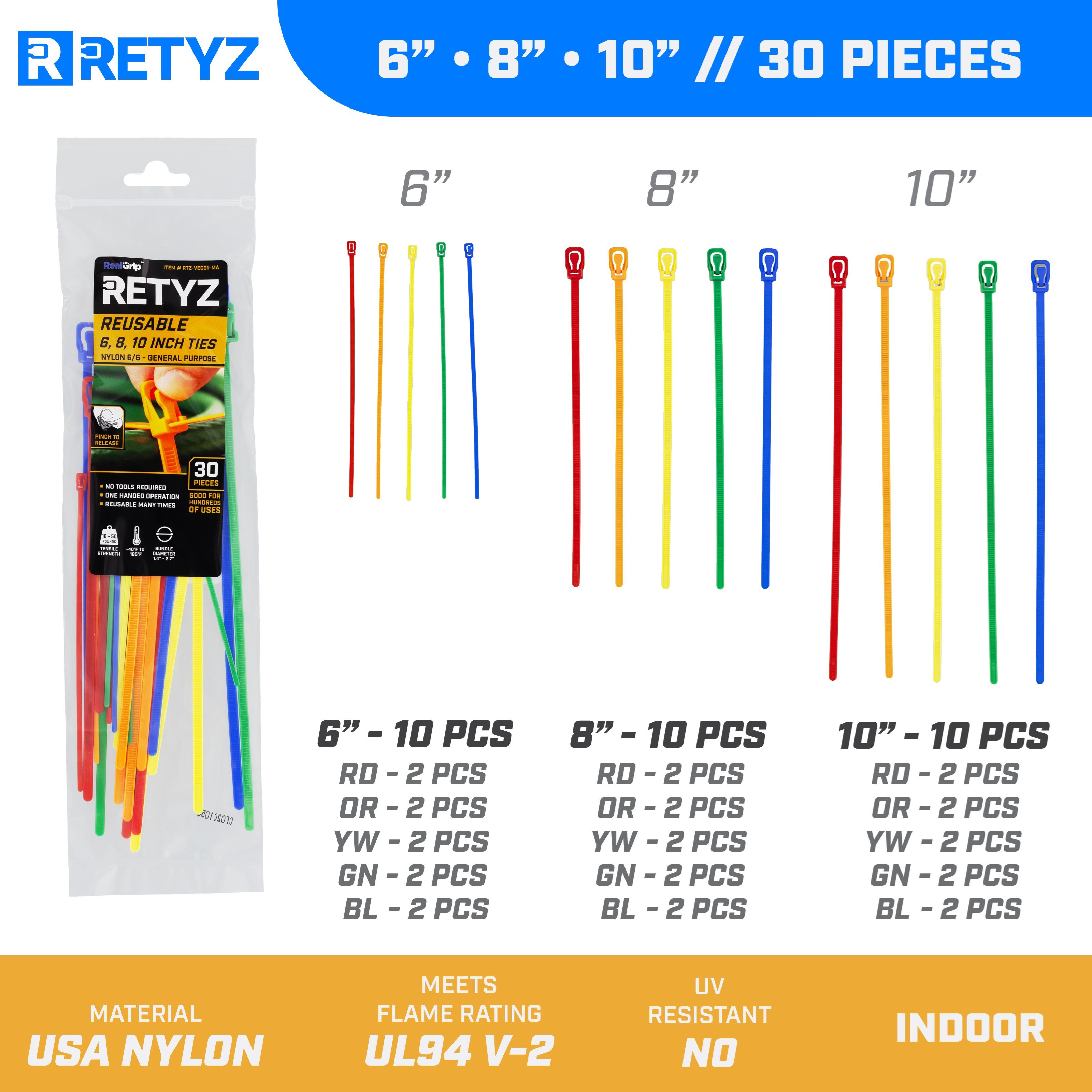 This 30-piece variety pack includes RETYZ reusable cable ties in three lengths—6", 8", and 10"—with five colors (Red, Orange, Yellow, Green, Blue) in each size. The 6" ties are VersaTie™ style, with a lighter-duty 18 lb tensile strength, perfect for small bundles or delicate items. The 8" and 10" ties are general-purpose strength with a 50 lb rating for heavier-duty needs.