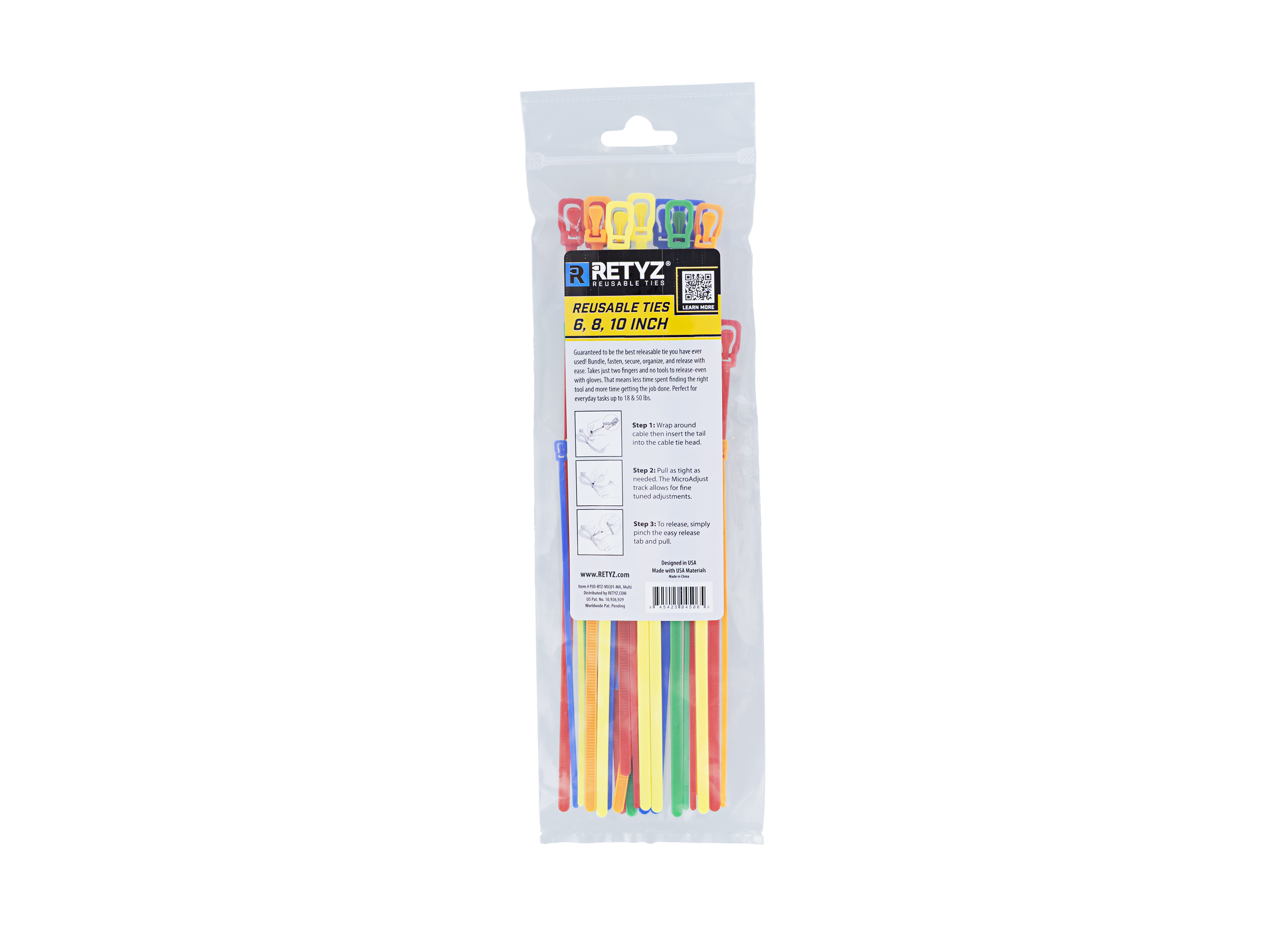 This combo pack includes 30 reusable cable ties in 5 bold colors—Blue, Green, Orange, Red, and Yellow—with 10 each of 6", 8", and 10" sizes. Co-branded with Paul Jr Designs, these ties are a shop favorite for sorting, bundling, and organizing. The 6" VersaTies™ offer 18 lb tensile strength, while the 8" and 10" EveryTies™ provide heavy-duty 50 lb performance.