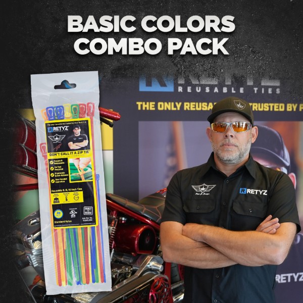 This combo pack includes 30 reusable cable ties in 5 bold colors-Blue, Green, Orange, Red, and Yellow-with 10 each of 6", 8", and 10" sizes. Co-branded with Paul Jr Designs, these ties are a shop favorite for sorting, bundling, and organizing. The 6" VersaTies™ offer 18 lb tensile strength, while the 8" and 10" EveryTies™ provide heavy-duty 50 lb performance.