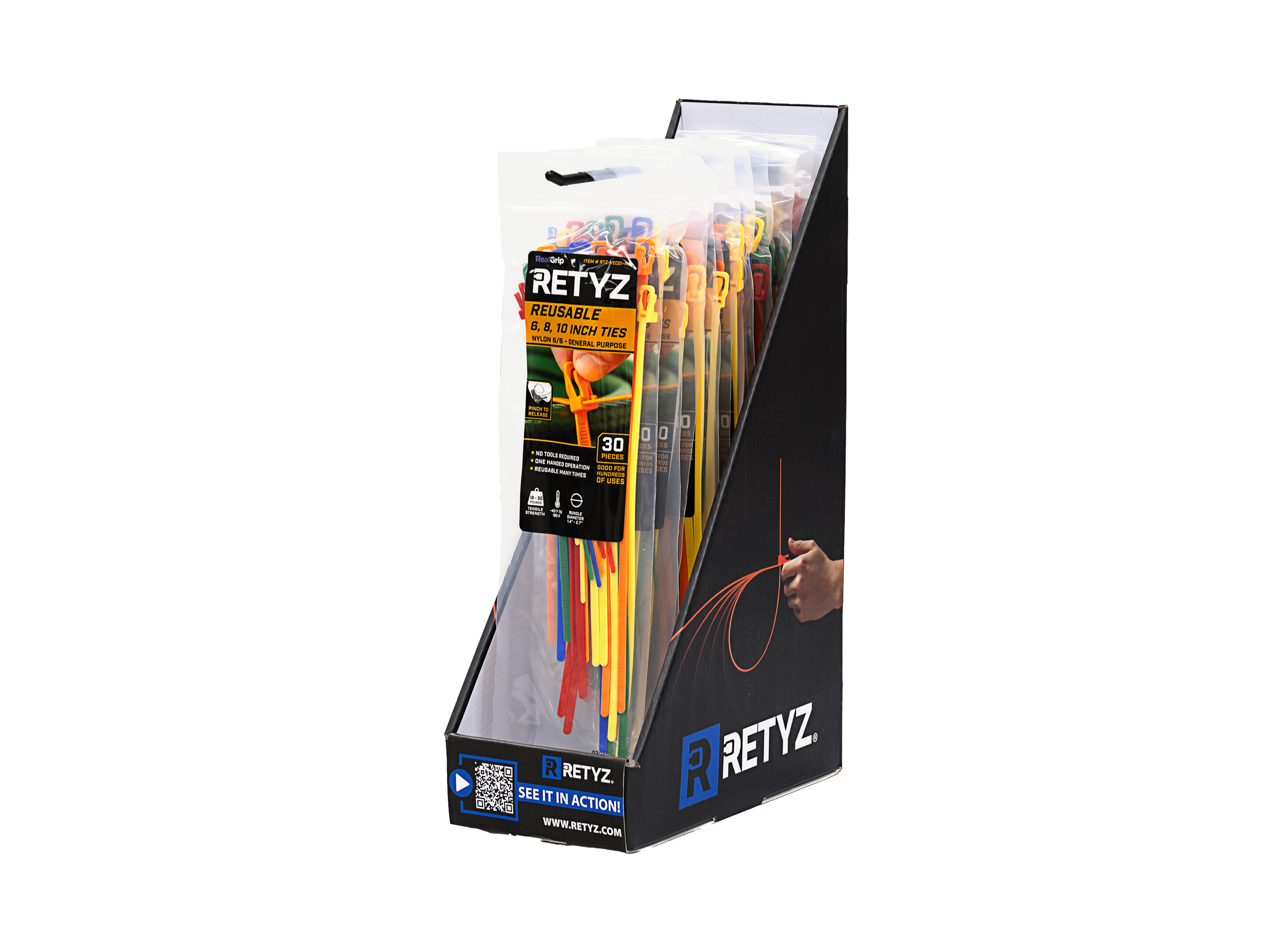 Display: 6 Inch Mini, 8 Inch, and 10 Inch 5-Color Variety Pack Reusable Tie - 30 Pcs - RTZ-VEC01-MA - 10 Packs