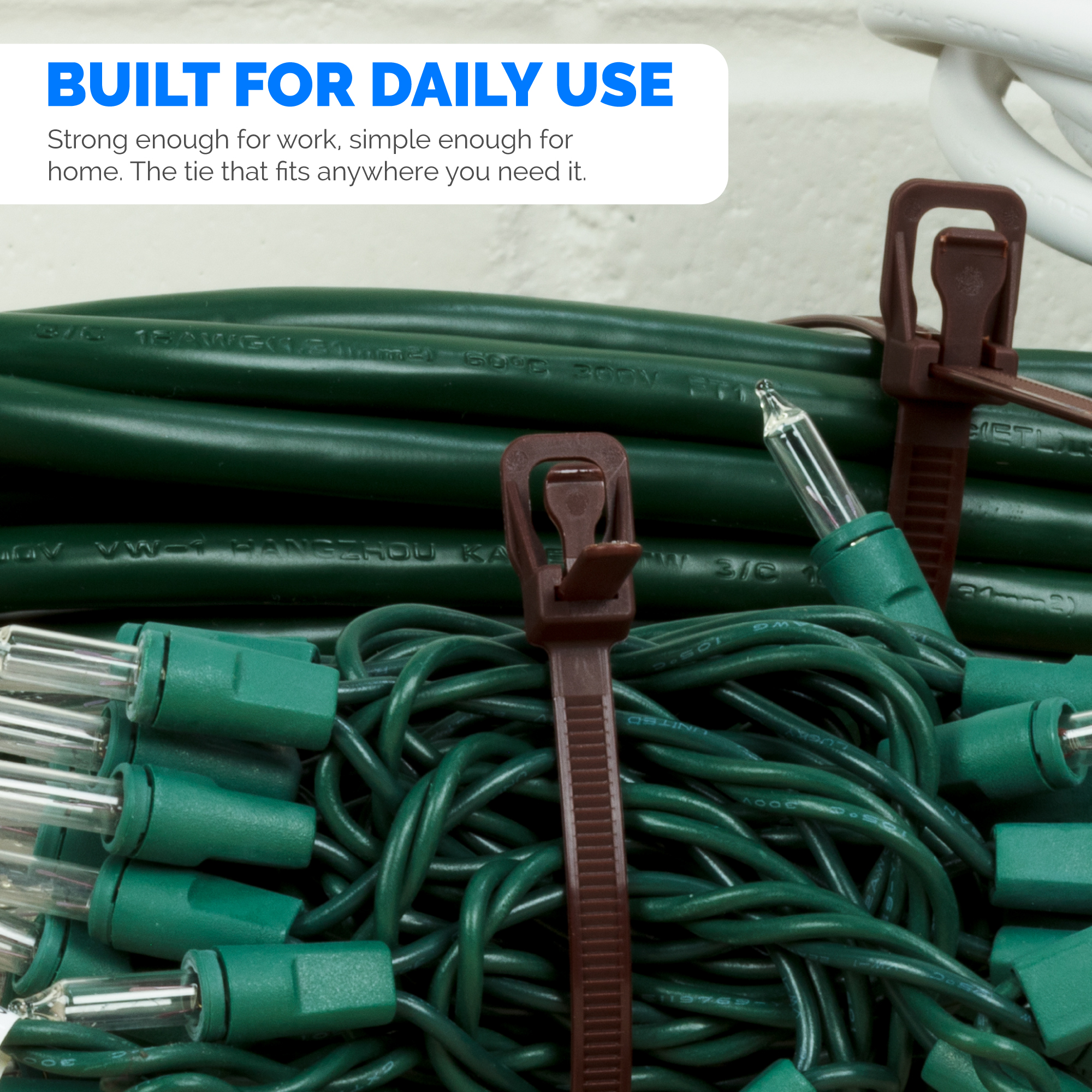 The RETYZ™ EveryTie UVShield resists sunlight exposure while delivering dependable 50 lb holding power. It is a solid choice for solar panel wiring, garden runs, and exterior cable routes that need repeat adjustments.