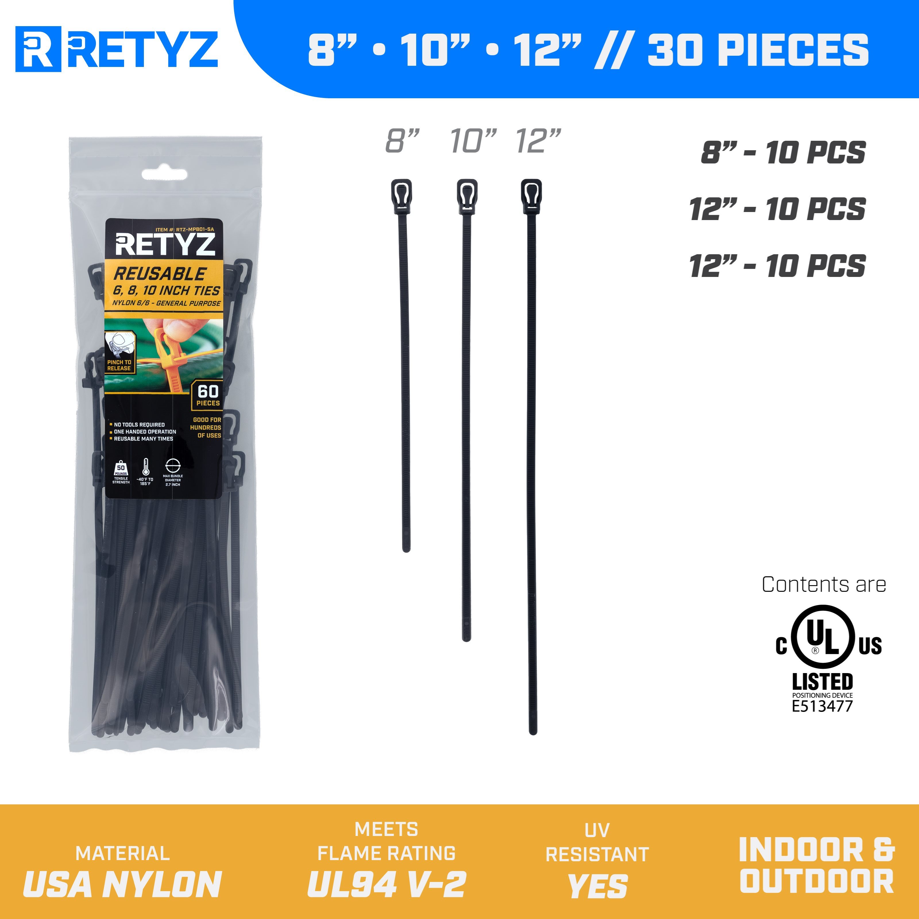 This combo pack includes 30 RETYZ EveryTie™ reusable cable ties in 8", 10", and 12" lengths—10 of each size. Each tie features a patented quick-release head for one-handed operation and a strong 50 lb tensile rating. Made in black for a clean, professional look, these ties are ideal for managing cables, securing gear, and reducing waste in both residential and commercial environments.