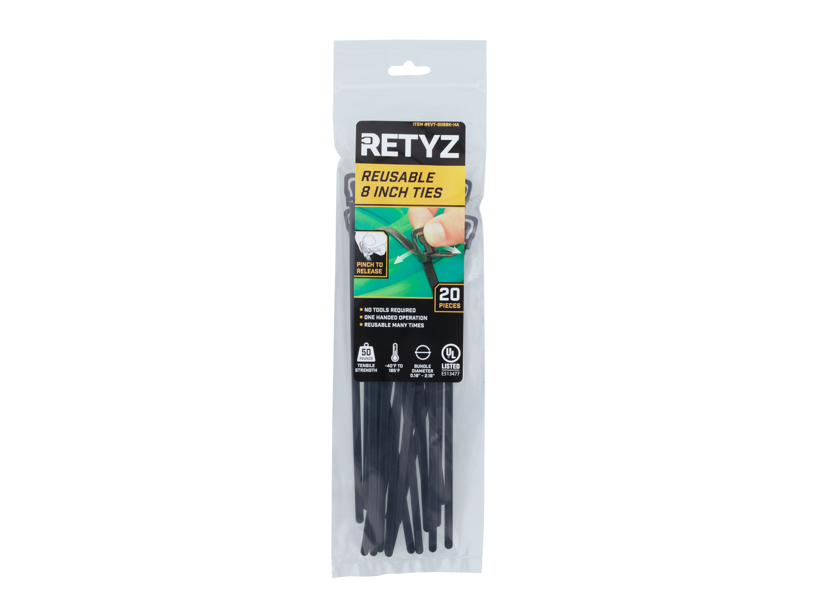 The RETYZ™ EveryTie in UV Black is your go-to solution for outdoor and high-tension applications. With a 50 lb tensile rating and added UV protection from a carbon black additive, this tie is made for long-lasting performance in the sun, on the job, or under the hood.